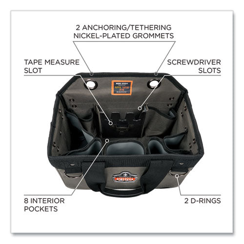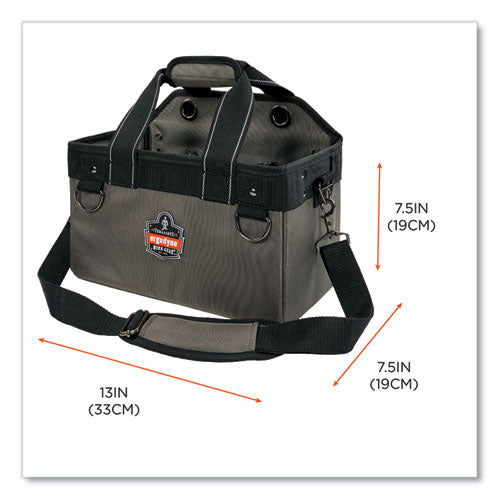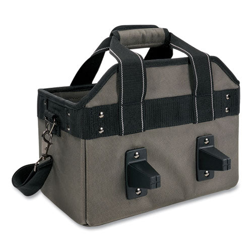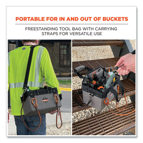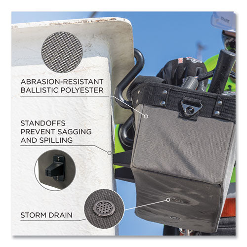The Arsenal 5844 Bucket Truck Tool Bag is designed to hang from aerial bucket hooks for secure storage, convenient tool organization, accessible tethering and prevention of dropped objects. Using a hanging tool bag maximizes space in compact buckets by keeping gear off the floor and out of the way. Unlike most other bucket storage solutions, this portable bag has a rigid freestanding base and carrying straps for versatile use in and out of buckets, preventing workers from needing an additional tool bag for other work environments. Also features standoffs on the side of the bag to keep it upright when hanging inside a bucket. Built for durability in demanding environments, this bucket bag is constructed of abrasion-resistant ballistic polyester with heavy-duty nylon webbing straps and nickel-plated grommets. A storm drain prevents water from building up inside and damaging tools. Ideal for work in bucket trucks, including telecom and utilities.Note: This is a non-returnable item.