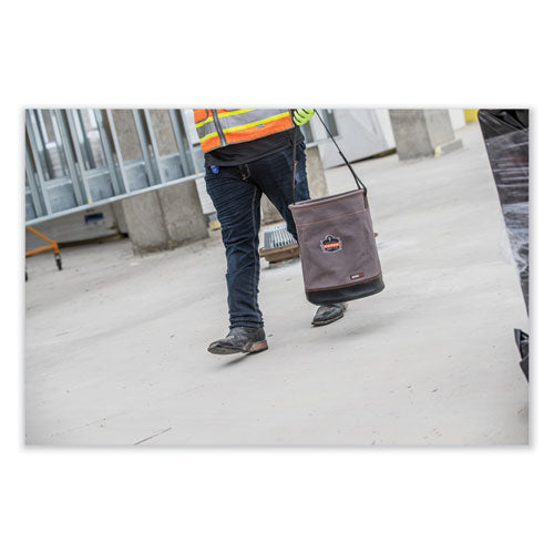 Durable 24 oz canvas main material, synthetic leather bottom bucket with storm drains. Webbing handle for strength and durability with d-ring connection on top for hoisting and two anchoring d-rings on rim of bucket for tool tethering.Note: This is a non-returnable item.