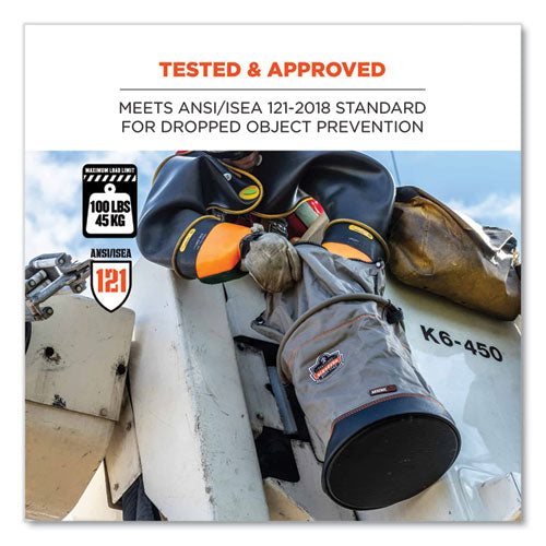 The Arsenal 5973 Large Nylon Hoist Bucket Tool Bag is certified to the ANSI/ISEA 121-2018 dropped object prevention standard for safely hoisting, storing and accessing tools while working at heights. Made primarily of 1200D nylon plus an 840D nylon top, synthetic leather bottom and heavy-duty YKK zipper closure this hoist bucket is built for long-lasting durability. Unlike other tool buckets, it includes a built-in zippered top for ensuring tools do not spill out when at heights. In addition to the zippered closure, the top ring of the bucket is molded to maintain a wide opening for easy viewing and access to tools. An interior pocket is also included for tool organization. The high-tensile webbing handle is reinforced with leather and tarpaulin, and features a durable alloy steel d-ring for hoisting. Rigorously tested and approved to the ANSI/ISEA 121-2018 standard for dropped object prevention.Note: This is a non-returnable item.