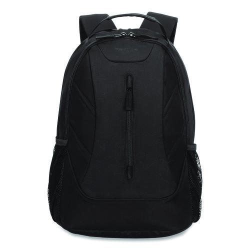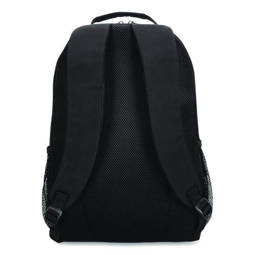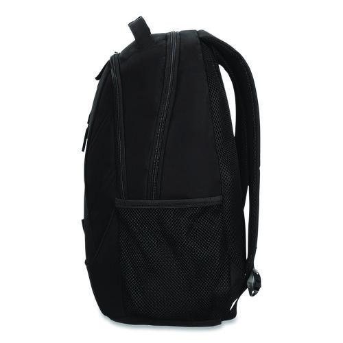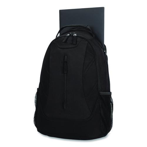 Arrange supplies, personal electronics and other items neatly inside this laptop backpack. Zippered stash pocket offers quick access to keys, debit cards and other frequently used items, while the side-mount mesh bottle holders keep favorite beverages close at hand. Padded laptop compartment shields devices against bumps and drops. Spacious main compartment provides room for file folders, books and binders, so you can store all your reading materials in one location. Multiple accessory pockets hold pens, pencils and other small office supplies, making it easy to work on the road. Padded back and soft-touch neoprene handle make this backpack comfortable to carry.