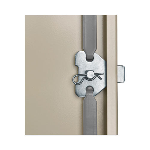 Assembled storage cabinet with three-point locking bar system locks top, bottom, and doors. Durable, reinforced doors with satin chrome double handles open 180° for easy access to contents. Industrial-grade steel with powder coat finish for long lasting use. The sturdy, 16-gauge door frame prevents racking. Heavy duty secure knuckle hinges for longevity. Built-in leveling glides help compensate for uneven floors.