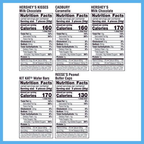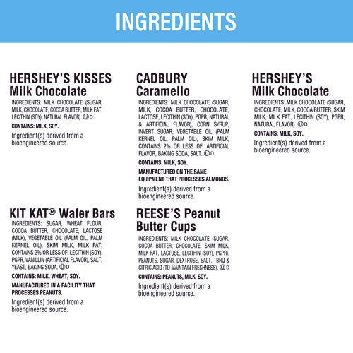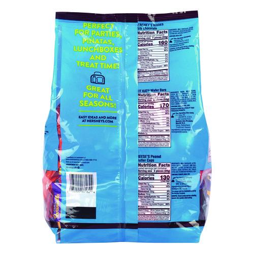 Enjoy a delicious milk chocolate treat anywhere and anytime with this value pack of Hershey assorted candy, perfect for parties, holidays and fundraisers. Offering five miniature crowd-pleasing favorites, this kosher candy assortment is perfect for sharing with family, friends, teammates or co-workers. Take this assorted candy bag into the office break room, pour some individually wrapped candies into your jar at home or take a bag to your next sports game to celebrate the win. This assortment includes Kit Kat milk chocolate wafer candy bars, Reese's milk chocolate peanut butter cups candy, Hershey's milk chocolate candy bars, Hershey's Kisses milk chocolate candy and Cadbury Caramello milk chocolate caramel candy bars. They're perfect for parties, lunch boxes, desserts, picnics, tailgate parties and more. Add this bag of miniature assorted milk chocolate candies to your holiday festivities, too. Stuff Christmas stockings, fill Easter baskets, create Valentine's Day gift bags and fill Halloween party candy bowls with these delicious milk chocolate treats that suit every occasion and every taste. Make the major holidays and all of the ordinary moments in between a little sweeter with this classic assortment.Note: This is a non-returnable item.