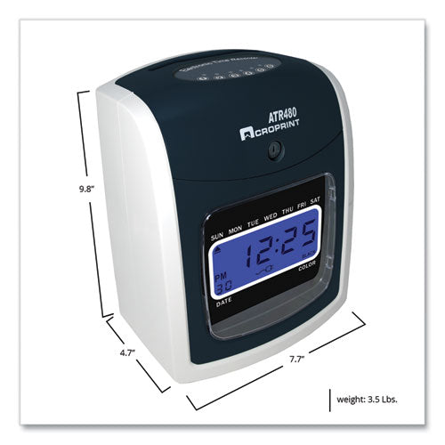 The ATR480 Time Clock automatically calculates and totals employee time for businesses with up to 50 employees. With this time clock, you can set overtime policies, implement rounding rules, and deduct break time to accommodate your payroll needs. The ATR480 supports job costing and can be set to automatically adjust for Daylight Saving Time. This top-loading clock features automatic card positioning and easy-to-read imprints in standard (AM/PM) or military (24 Hour) time. Employee time can be set to record in minutes or hundredths. A two-color printing option makes it easy to spot early and late punches. Use the built-in programmable buzzer or connect to an external signal device to notify employees about shift start and stop times. To enhance security, clock programming can be password protected and the clock case is secured with lock and key to prevent tampering. The built-in battery allows employees to keep punching, even during power outages. Bundle includes three two-color ribbons (one installed, two extra), 300 time cards, two 10-pocket time card racks, four keys, owners manual and power cord.Package Includes: (3) 2-Color Ribbons (One Installed, Two Extra); (300) Time Cards; (2) 10-Pocket Time Card Racks; (4) Keys; Owners Manual; Power Cord