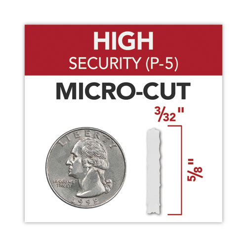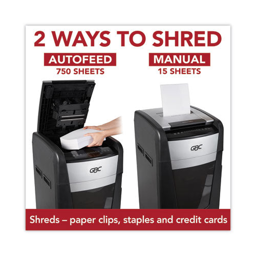 For your biggest shredding jobs, choose the fully-automatic GBC AutoFeed+ Shredder. Stack up to 750 sheets in the feeder for automatic shredding or manually feed up to 15 sheets at once. Micro-cut (P-5) shred style safely shreds confidential or sensitive documents. Runs ultra-quietly to help minimize noisy disruptions in large offices. Powerful induction motor with 240-minute continuous run time and oversized 37 gal bin let you shred longer without stopping. A lockable feeding tray provides additional security to your shredded documents. Auto shreds documents, paper clips and staples, while credit cards must be manually inserted.