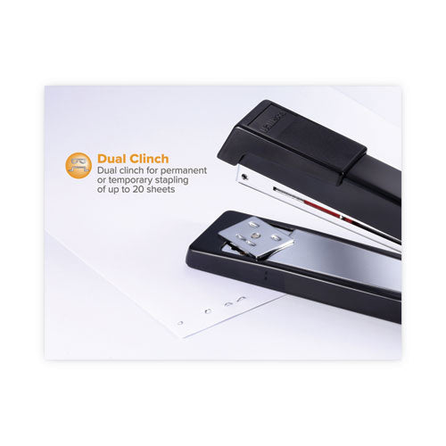 A popular desktop classic that delivers a lifetime of reliable performance. Constructed entirely of metal, this traditional full-strip stapler staples up to 20 sheets and features the ability to choose adjust for standard stapling or temporary stapling with a quick flip of the Dual Clinch plate.