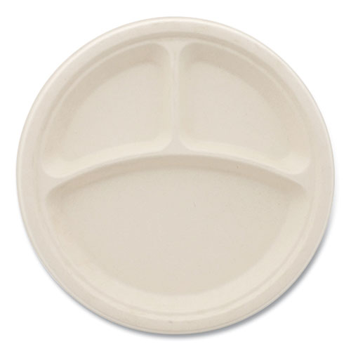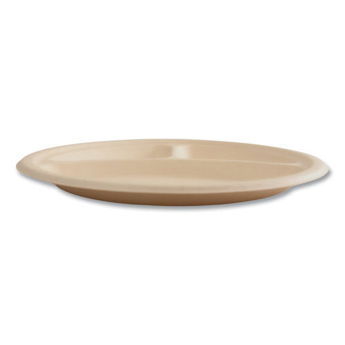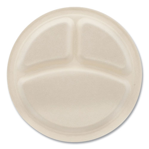 Bagasse PFAS-Free Dinnerware, 3-Compartment Plate, Sugarcane, 10" dia, Tan, 500/Carton