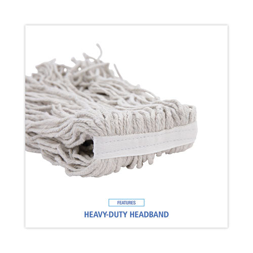 Ultra-absorbent white, natural cotton fiber is ideal for general mopping and all-purpose cleaning in any environment. Heavy-duty, 1.25" cotton headband adds to quality and durability. Soft enough to use on delicate floors, but strong enough to handle tough stains and cleaning products. For use with clamp style mop handle. Handle sold separately so you can customize your mop head size and replace when needed.