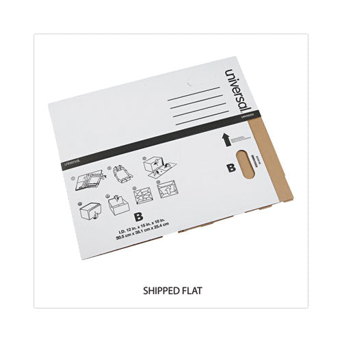Medium-duty, standard set-up boxes that are great for storage of letter or legal files. Ideal for stacking and storage on shelves. Lift-off lid allows for semi-active use to add and remove files as needed. Equipped with two built-in side handles for easy transport and storage. The easy assembly boxes can be put together without packaging tape. Collapsible and reusable. Made of corrugated cardboard with 350-pound stacking strength.