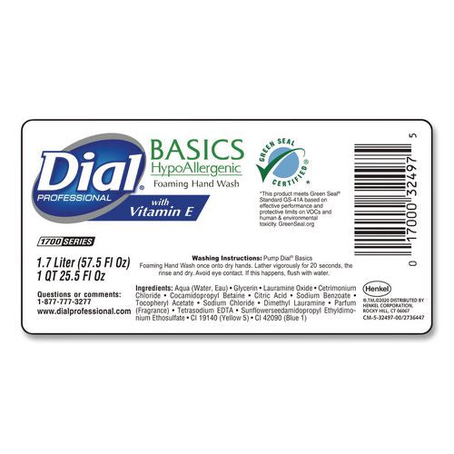 Refill for Dial 1700 Manual Dispenser. Foaming hand wash that is a mild, pleasing soap that's gentle on skin. Dermatologist-tested and hypoallergenic. Rinses clean and is excellent for frequent hand washing. Perfect for any commercial setting including healthcare facilities, schools, offices, restaurants, daycares and more.