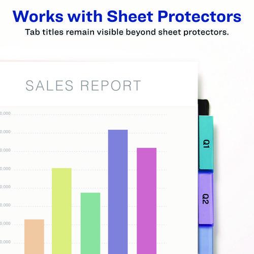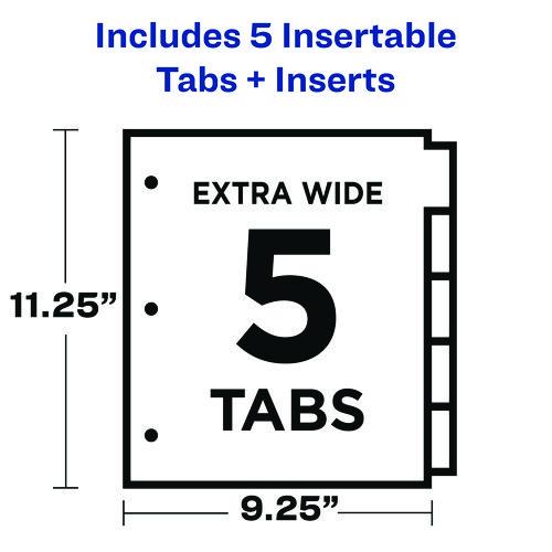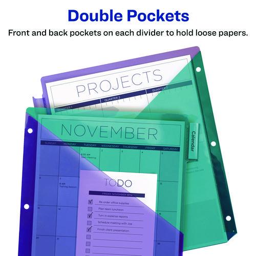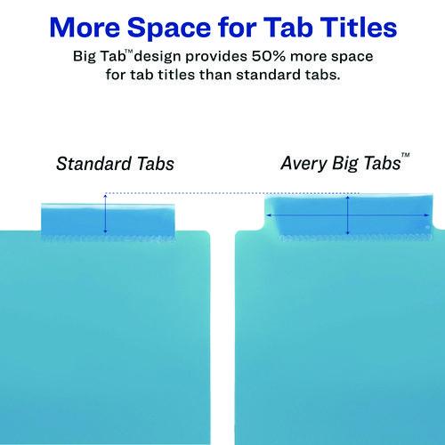 Big Tab™ dividers are bigger, providing 1.5 times more writing space than standard tabs. Special tab design secures inserts, making it easy to insert and remove tab titles. Double front/back pocket style provide extra storage. Durable plastic allows for frequent reference.