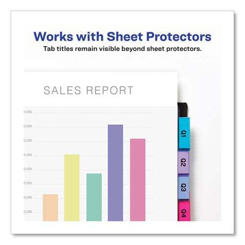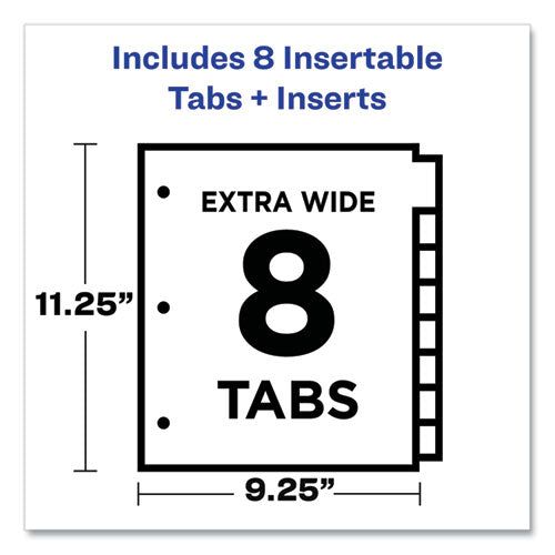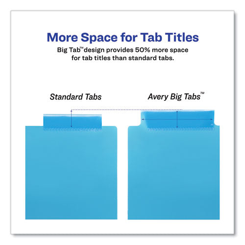 Big Tab™ dividers are bigger, providing 1.5 times more writing space than standard tabs. Special tab design secures inserts, making it easy to insert and remove tab titles. Double front/back pocket style provide extra storage. Durable plastic allows for frequent reference.