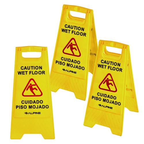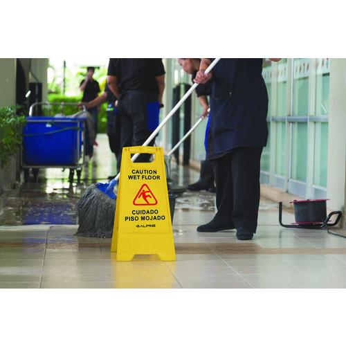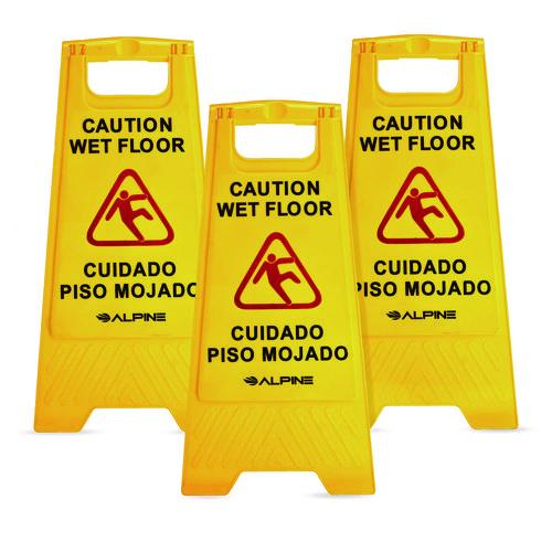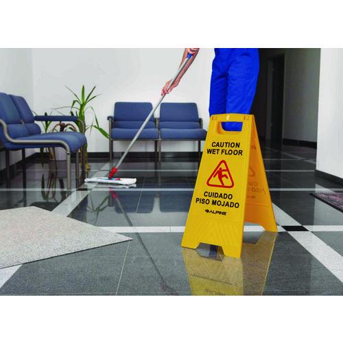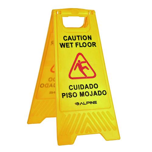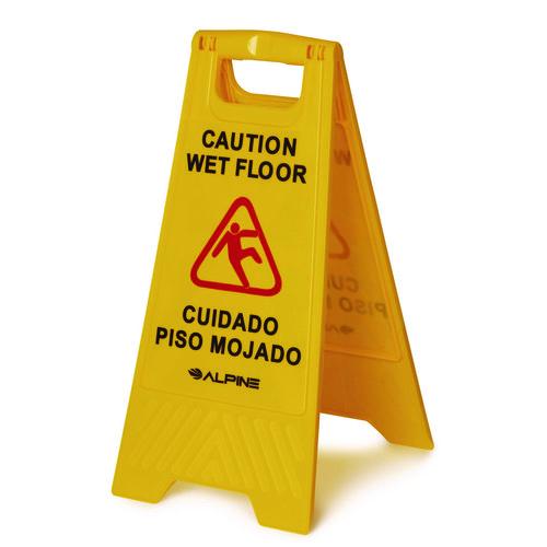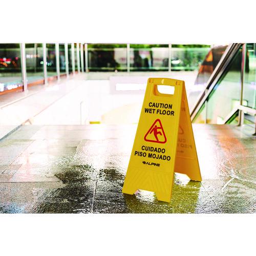 The Alpine Industries yellow bilingual 2-sided Wet Floor sign prevents your customers and employees from injuring themselves on dangerous slippery surfaces with clear identification. This sign is constructed of a durable polypropylene plastic. The material boasts a high resistance to electricity and is chemical- and mildew-resistant, making it suitable for any environment. As such, it can easily be used in the workplace, grocery store, industrial site and other retail locations. The A-frame style offers quick and easy setup in any space, while the 24" size makes it ideal for use in tight, narrow areas. There's even a handle at the top for easy transporting from one location to the next. When not in use, the sign folds flat for convenient storage on a janitor cart or inside a closet.Note: This is a non-returnable item.