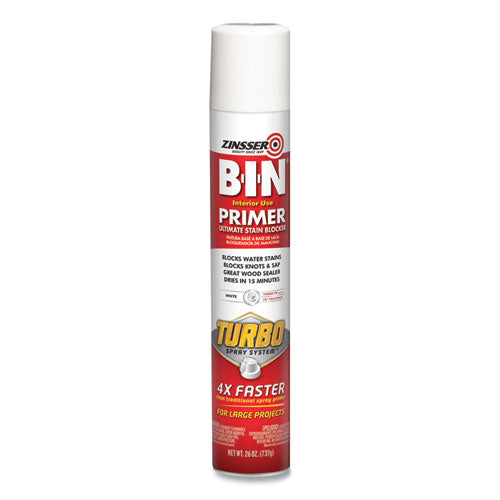 Get the speed and quality of professional spray systems without the hassle. BIN Aerosol Primer with Turbo Spray System combines the power of BIN primers with the speed and convenience of the Turbo Spray System. Always great for blocking stains and odors associated with water-, smoke- and fire-damage, BIN professional primers are uniquely suited for disaster restoration jobs. As they block odors from pets, mildew and cigarettes, they're perfect for a wider variety of specialty painting projects, too. For added versatility, they also employ shellac and rosin binders, which easily sand to a powder when dry, allowing BIN primers to double as excellent wood sealers. The proprietary Turbo Spray System delivers a wide, 10" spray pattern and four-times the output of traditional primer sprays, ensuring fast and easy full coverage. For best results, hold can upright 18 to 24 inches from the intended surface, and spray in a steady back-and-forth motion, slightly overlapping on each stroke.