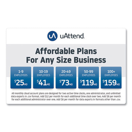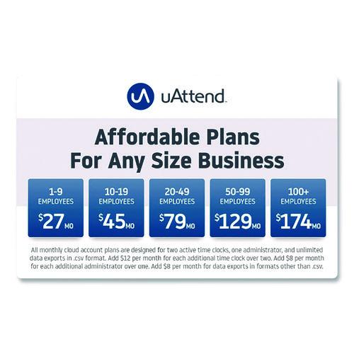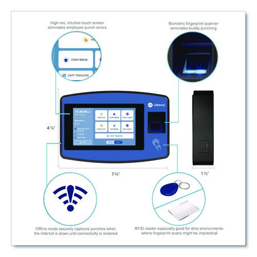 The uAttend NX2500 biometric fingerprint touch tablet time clock includes everything you need to effortlessly track time and attendance. The system offers multiple capabilities within one device, including a fingerprint scanner, RFID, PIN, and web browser punching, plus offline mode and easy Wi-Fi or LAN connection. This easy-to-use time clock offers support for an unlimited number of employees and departments, large touch-screen display, and biometric fingerprint scanner to help eliminate costly buddy punching. The time clock is Cloud-connected, so it automatically sends all time clock data to the Cloud in real time, where you can view it from any web browser. The Cloud lets you automate your timekeeping processes by letting you set up automatic rules for punch rounding, lockouts, breaks, overtime, and accruals to help you stay in line with compliance and accurately calculate your employees' hours. Access dozens of reports with business insights and analytics, and export payroll reports to your payroll provider or directly to QuickBooks Desktop.