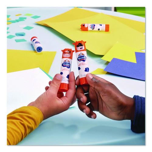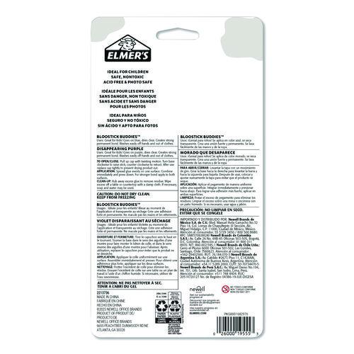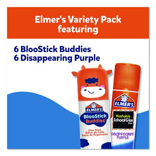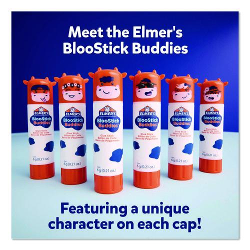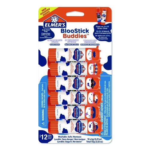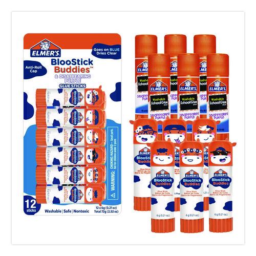 See exactly where you're applying adhesive with this combo pack of Elmer's Glue Sticks! First, you'll get a set of Elmer's BlooStick Buddies Glue Sticks to turn up the fun on any arts, crafts, or school project! Each cap of these school glue sticks highlights a special character with their own unique personality. The playful ears double as an anti-roll device while the funny face on each cap will encourage kids to keep the cap on when not in use. Best of all, these glue sticks go on blue and dry clear. You'll also receive a set of Disappearing Purple Glue Sticks, that do the same, but in purple! All Elmer's glue sticks in this pack are safe, washable, and nontoxic, perfect for school or home.Package Includes: (6) Bloostick Buddies Glues Sticks; (6) Disappearing Purple Glue Sticks