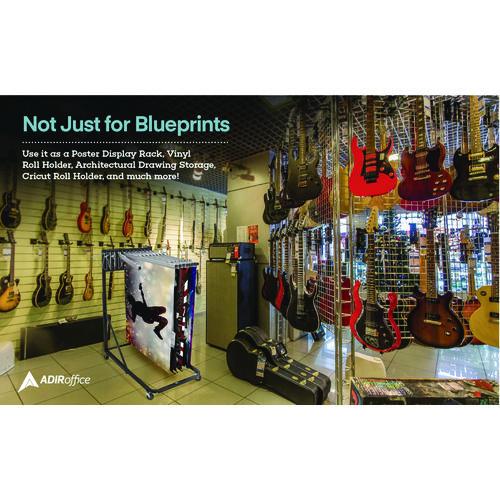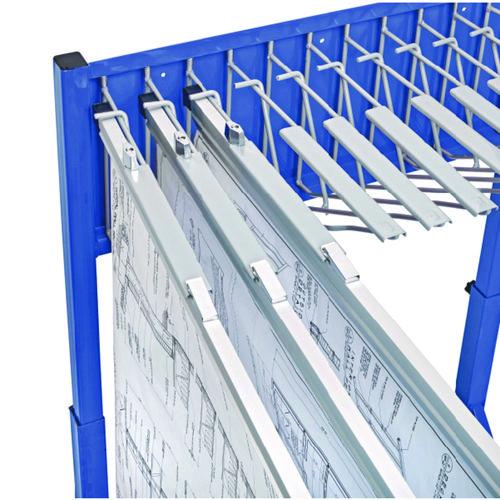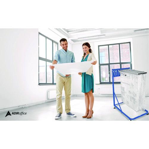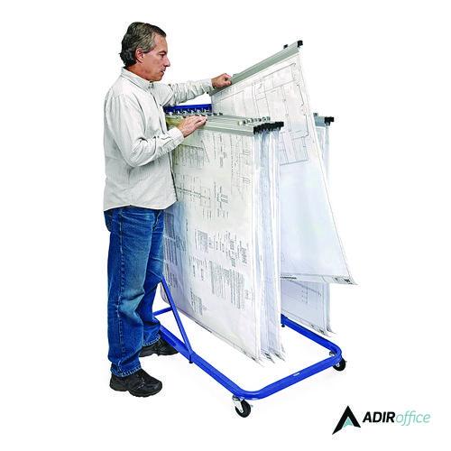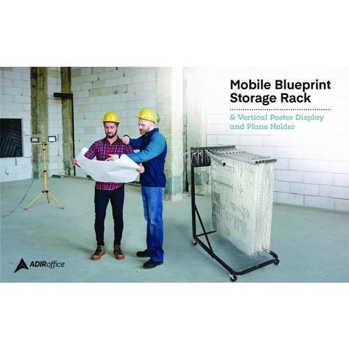 The AdirOffice Vertical File Rolling Stand with 12 Brackets provides hanging blueprint storage that's convenient and easy to get to. The 12 pivot brackets swing out wide so it's a cinch to see and access your blueprints, plan drawings, maps, or other large documents. Just clamp your files into a hanging paper clamp (sold separately) and snap it onto one of the brackets. The brackets accommodate any size clamp, so you can fit documents in a variety of sizes onto this mobile blueprint stand at the same time. This mobile blueprint rack is adjustable to fit even your largest files. Made of solid steel, with a 240 lbs weight capacity (20 lbs per bracket), this hanging file rack can hold a lot of documents. It's easy to move your documents from room to room on this mobile plan rack, which has four 3" swivel wheels. The front two lock to hold it stable when you get it to its destination. Will accommodate all hanging clamps between 18", 24", 30, 36 and 42. (Clamps sold separately.)Note: This is a non-returnable item.