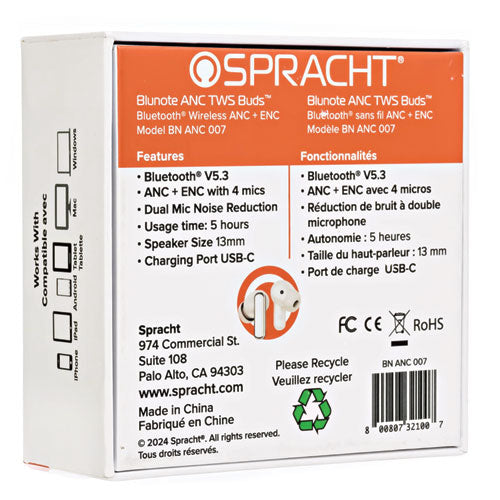 Take calls or listen to music on these super comfortable in earbuds by Spracht. Discover your portable audio sanctuary with Blunote ANC TWS Bluetooth Ear Buds. Effortlessly connect to your smartphone, tablet, or PC/Mac for a seamless wire-free experience for music and calls at your fingertips. Immerse yourself in sound with Active Noise Cancellation, which blocks external noise and is ideal for listening to music, podcasts or video. Crystal-clear calls are thanks to high-quality microphones and Environmental Noise Cancellation (ENC) technology, which filters surrounding noise for superior clarity. Bluetooth V5.3, provides a wireless range of 10 meters! Compact and stylish, these earbuds provide over five hours of talk time and the convenience of voice assistant compatibility. Recharge the case with the included Type C/USB cable. Blunote ANC TWS Bluetooth Ear Buds will Elevate your audio experience, wherever you go. Great in the office, on the road, exercising or simply relaxing at home!Package Includes: Ear Bud Charging Case; USB/Type-C Charging Cable; User Guide