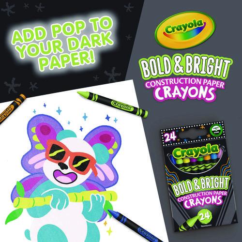 Crayola Bold and Bright Construction Paper Crayons make coloring on colored craft paper a breeze! Kids will love finally seeing their works of art pop, no matter what backdrop they choose. This set of art tools features 24 vibrant, creamy crayons in both primary and secondary colors. Bold and bright tones give children a rainbow of hues to choose from. Unique formula produces extra bold results, these crayons appear on construction paper, paper bags, cardboard, and more! Pair with a pack of Crayola Construction Paper (sold separately) for a great bundled gift for kids. Safe and nontoxic, ideal for ages 3 and up.Note: This is a non-returnable item.