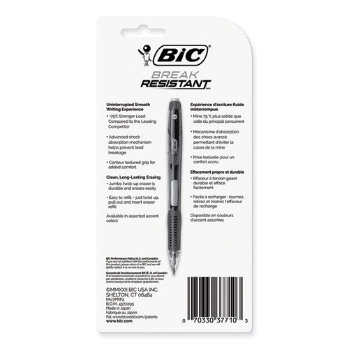 No more broken leads. Enjoy a smooth, uninterrupted writing experience with the BIC Break-Resistant mechanical pencils, thanks to the specially formulated 0.7 mm lead and an innovative shock-absorption mechanism that has a 75% stronger lead. Crafted with thoughtful design from top to bottom, the BIC Break-Resistant mechanical pencil is the tool for any type of writing from jotting down a simple shopping list to composing long-form letters, drafting professional documents to taking standardized tests, and everything in between. Avoid the frustration of flimsy lead that snaps easily and requires constant replacement with these pencils that go the distance and last as long as your inspiration.Package Includes: (2) Replacement Jumbo Erasers; Extra Break-Resistant Leads