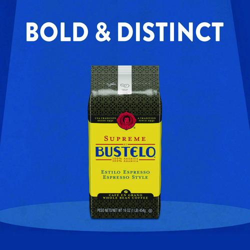 ˇEstás invitado! Supreme by Bustelo espresso style whole bean coffee is a premium Café Bustelo coffee product specially roasted for a uniquely bold taste and complex aroma. Every cup of this medium dark roast coffee delivers a distinct, vibrant flavor that stands up to milk and sugar. Thanks to its whole bean form, you can grind your coffee exactly the way you like it for virtually any brewing method. It's the perfect way to enjoy a rich and flavorful cafecito at home, whenever the mood strikes you. Buy a bag today for a Latin-inspired coffee experience that's truly supreme.Note: This is a non-returnable item.