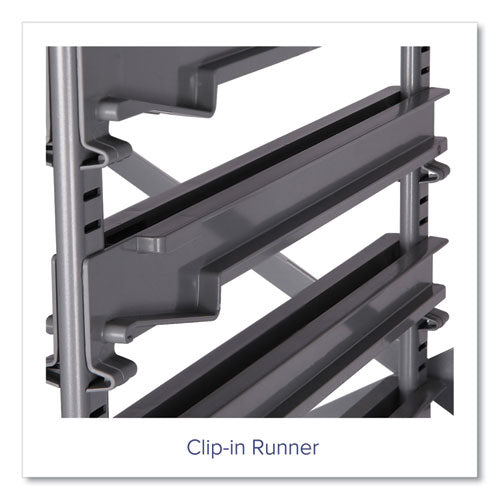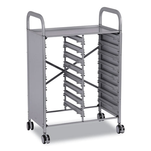 Versatile, modern and secure, the Callero Plus Double Column Trolley is designed with STEM, STEAM and collaborative learning in mind. Its multi-bin concept and double-wide format deliver lots of flexibility. Transport your equipment from place to place and create a one-stop central location for all of your students' necessary supplies. Child-friendly StopSafe runners make it easy to access the bins' contents while preventing the bins from being pulled out of their slot, eliminating the possibility of messy, accidental spills. At the same time, teachers can remove and/or adjust the runners to accommodate any size F-series tray: deep or shallow, either or both in one trolley. Durable steel frame is enclosed on the sides for added security, and both the frame and panels feature a tough, powder-coat finish. Ergonomic handles and included casters (two locking) make it easy to maneuver the cart either down the hall or fully across campus. Trolley's top shelf also doubles as a worksurface for demonstrating and testing out ideas. Completely free of sharp corners and edges, these trolleys are ideal for students of all ages, from Pre-K through adult learning.Package Includes: (16) Light Gray F1 Shallow TraysNote: This is a non-returnable item.