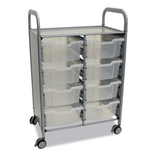 Versatile, modern and secure, the Callero Plus Double Column Trolley is designed with STEM, STEAM and collaborative learning in mind. Its multi-bin concept and double-wide format deliver lots of flexibility. Transport your equipment from place to place and create a one-stop central location for all of your students' necessary supplies. Child-friendly StopSafe runners make it easy to access the bins' contents while preventing the bins from being pulled out of their slot, eliminating the possibility of messy, accidental spills. At the same time, teachers can remove and/or adjust the runners to accommodate any size F-series tray: deep or shallow, either or both in one trolley. Durable steel frame is enclosed on the sides for added security, and both the frame and panels feature a tough, powder-coat finish. Ergonomic handles and included casters (two locking) make it easy to maneuver the cart either down the hall or fully across campus. Trolley's top shelf also doubles as a worksurface for demonstrating and testing out ideas. Completely free of sharp corners and edges, these trolleys are ideal for students of all ages, from Pre-K through adult learning.Package Includes: (8) Translucent Frost F2 Deep TraysNote: This is a non-returnable item.