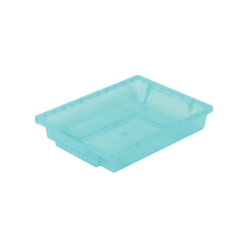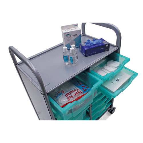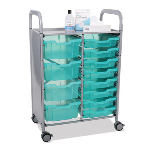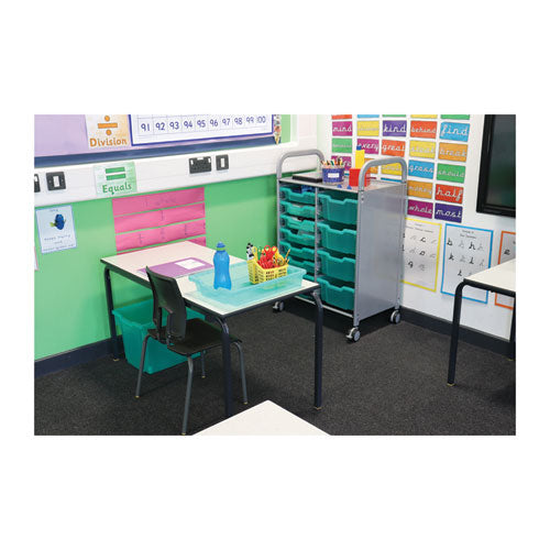 Ultra-versatile Callero Plus Shield Double Trolley features BioCote® antimicrobial product protection embedded in its finish and within the construction of the included bins to reduce the potential for the growth of bacteria, mold and fungi by up to 99.99% the protection has even been tested and proven effective after years of exposure to commonly used disinfectants and cleaning products, ensuring long-lasting protection and enduring peace of mind. Akin to the classic Callero Plus Double line, this trolley features a multi-bin concept with a double-wide format to help you maximize your available storage space, making it ideal for use in educational environments. StopSafe runners make it easy to access the bins' contents while preventing the bins from being pulled out of their slot, eliminating the possibility of messy, accidental spills. At the same time, the runners can be removed and/or adjusted to accommodate any size F-series tray: deep or shallow, either or both in one trolley. Durable steel frame is enclosed on the sides, and both the frame and panels feature a tough, powder-coat finish. Trolley's top shelf also doubles as a worksurface for demonstrating and testing out ideas. Ergonomic handles and included casters (two locking) make it easy to maneuver your trolley wherever you need to go.Package Includes: (8) Translucent Kiwi F1 1.85 gal Capacity 3.25" Shallow Trays; (4) Translucent Kiwi F2 3.57 gal Capacity 6.25" Deep TraysNote: This is a non-returnable item.