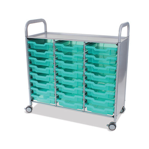 Ultra-versatile Callero Plus Shield Treble Trolley features BioCote® antimicrobial protection embedded in its finish and within the construction of the included bins to reduce the potential for the growth of bacteria, mold and fungi by up to 99.99% the protection has even been tested and proven effective after years of exposure to commonly used disinfectants and cleaning products, ensuring long-lasting protection and enduring peace of mind. Akin to the classic Callero Plus Treble line, this trolley features a multi-bin concept with a triple-wide format to help you maximize your available storage space, making it ideal for use in either educational or medical environments. StopSafe runners make it easy to access the bins' contents while preventing the bins from being pulled out of their slot, eliminating the possibility of messy, accidental spills. At the same time, the runners can be removed and/or adjusted to accommodate any size F-series tray: deep or shallow, either or both in one trolley. Durable steel frame is enclosed on the sides, and both the frame and panels feature a tough, powder-coat finish. Ergonomic handles and included casters (two locking) make it easy to maneuver your trolley wherever you need to go.Package Includes: (24) Translucent Kiwi F1 Shallow TraysNote: This is a non-returnable item.
