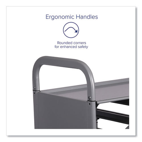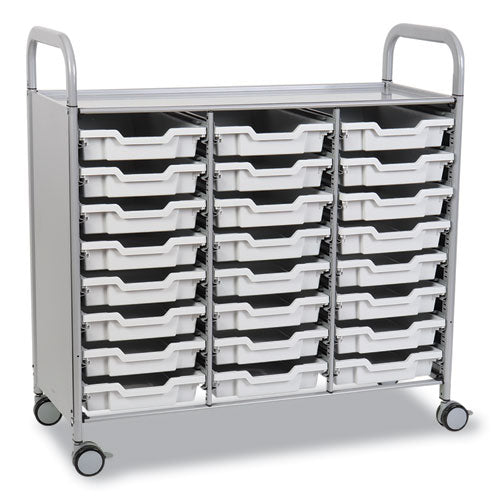 Versatile, modern and secure, the Callero Plus Treble Column Trolley is designed with STEM, STEAM and collaborative learning in mind. Its multi-bin concept and triple-wide format deliver maximum flexibility. Transport your equipment from place to place and create a one-stop central location for all of your students' necessary supplies. Child-friendly StopSafe runners make it easy to access the bins' contents while preventing the bins from being pulled out of their slot, eliminating the possibility of messy, accidental spills. At the same time, teachers can remove and/or adjust the runners to accommodate any size F-series tray: deep or shallow, either or both in one trolley. Durable steel frame is enclosed on the sides for added security, and both the frame and panels feature a tough, powder-coat finish. Ergonomic handles and included casters (two locking) make it easy to maneuver the cart either down the hall or fully across campus. Trolley's top shelf also doubles as a worksurface for demonstrating and testing out ideas. Completely free of sharp corners and edges, these trolleys are ideal for students of all ages, from Pre-K through adult learning.Package Includes: (24) Light Gray F1 Shallow Trays; (2) Locking Swivel Casters; (2) Non-Locking Swivel Casters; (4) Stationary Shelving GlidesNote: This is a non-returnable item.