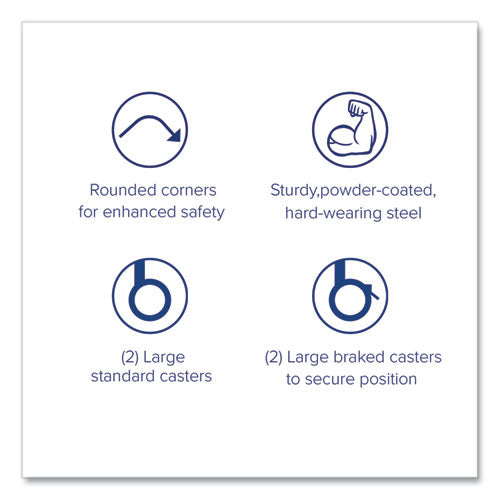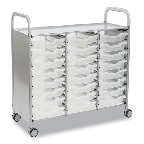 Versatile, modern and secure, the Callero Plus Treble Column Trolley is designed with STEM, STEAM and collaborative learning in mind. Its multi-bin concept and triple-wide format deliver maximum flexibility. Transport your equipment from place to place and create a one-stop central location for all of your students' necessary supplies. Child-friendly StopSafe runners make it easy to access the bins' contents while preventing the bins from being pulled out of their slot, eliminating the possibility of messy, accidental spills. At the same time, teachers can remove and/or adjust the runners to accommodate any size F-series tray: deep or shallow, either or both in one trolley. Durable steel frame is enclosed on the sides for added security, and both the frame and panels feature a tough, powder-coat finish. Ergonomic handles and included casters (two locking) make it easy to maneuver the cart either down the hall or fully across campus. Trolley's top shelf also doubles as a worksurface for demonstrating and testing out ideas. Completely free of sharp corners and edges, these trolleys are ideal for students of all ages, from Pre-K through adult learning.Package Includes: (24) Translucent Frost F1 Shallow Trays; (2) Locking Swivel Casters; (2) Non-Locking Swivel Casters; (4) Stationary Shelving GlidesNote: This is a non-returnable item.