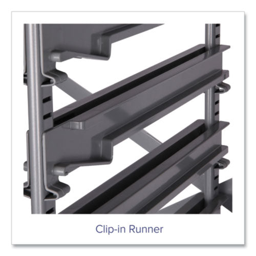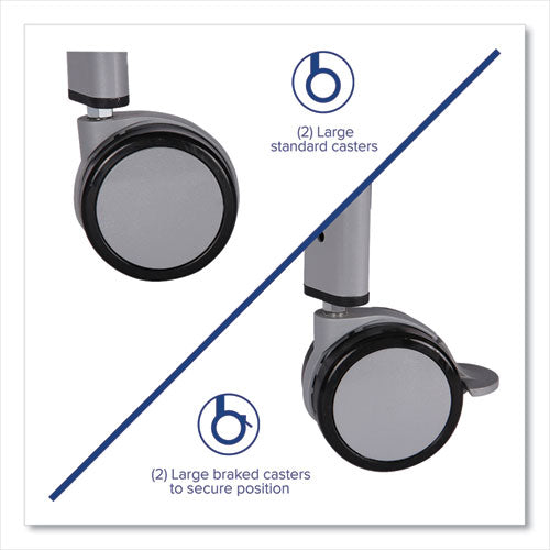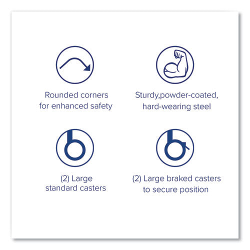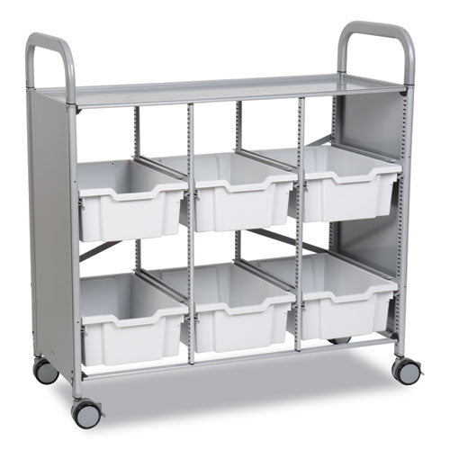 Versatile, modern and secure, the Callero Plus Treble Column Trolley is designed with STEM, STEAM and collaborative learning in mind. Its multi-bin concept and triple-wide format deliver maximum flexibility. Transport your equipment from place to place and create a one-stop central location for all of your students' necessary supplies. Child-friendly StopSafe runners make it easy to access the bins' contents while preventing the bins from being pulled out of their slot, eliminating the possibility of messy, accidental spills. At the same time, teachers can remove and/or adjust the runners to accommodate any size F-series tray: deep or shallow, either or both in one trolley. Durable steel frame is enclosed on the sides for added security, and both the frame and panels feature a tough, powder-coat finish. Ergonomic handles and included casters (two locking) make it easy to maneuver the cart either down the hall or fully across campus. Trolley's top shelf also doubles as a worksurface for demonstrating and testing out ideas. Completely free of sharp corners and edges, these trolleys are ideal for students of all ages, from Pre-K through adult learning.Package Includes: (6) Light Gray F2 Deep Trays; (2) Locking Swivel Casters; (2) Non-Locking Swivel Casters; (4) Stationary Shelving GlidesNote: This is a non-returnable item.