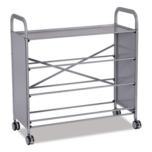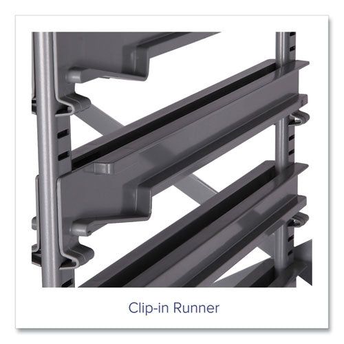 Versatile, modern and secure, the Callero Plus Treble Column Trolley is designed with STEM, STEAM and collaborative learning in mind. Its multi-bin concept and triple-wide format deliver maximum flexibility. Transport your equipment from place to place and create a one-stop central location for all of your students' necessary supplies. Child-friendly StopSafe runners make it easy to access the bins' contents while preventing the bins from being pulled out of their slot, eliminating the possibility of messy, accidental spills. At the same time, teachers can remove and/or adjust the runners to accommodate any size F-series tray: deep or shallow, either or both in one trolley. Durable steel frame is enclosed on the sides for added security, and both the frame and panels feature a tough, powder-coat finish. Ergonomic handles and included casters (two locking) make it easy to maneuver the cart either down the hall or fully across campus. Trolley's top shelf also doubles as a worksurface for demonstrating and testing out ideas. Completely free of sharp corners and edges, these trolleys are ideal for students of all ages, from Pre-K through adult learning.Package Includes: (16) Royal Blue F1 1.85 gal Capacity 3.25" Shallow Trays; (4) Royal Blue F2 3.57 gal Capacity 6.25" Deep Trays; (2) Locking Swivel Casters; (2) Non-Locking Swivel Casters; (4) Stationary Shelving GlidesNote: This is a non-returnable item.