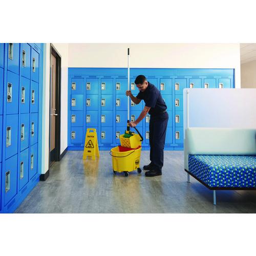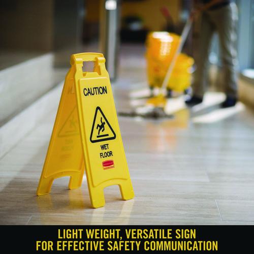 The Rubbermaid Commercial 2-Sided Floor Safety Sign with "Caution Wet Floor" Imprint is lightweight and versatile. The caution sign makes a heavy statement about safety. The 25-inch model is suitable for use in narrow areas. The folding design allows for convenient storage or transport on a janitor cart. Each of the wet floor signs has caution warning messages imprinted in easy-to-read lettering for effective communication. The warning sign features durable plastic construction that will not rust, corrode, or fade. The 2-sided, bright yellow design meets OSHA requirements. The flexible locking-style hanger makes the sign stationary and visible from all directions. Measures 12" deep when open.