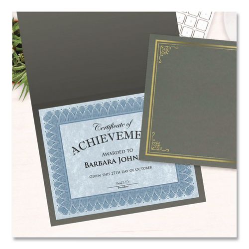 The perfect way to hold and frame precious documents and certificates. Premium 80-lb linen textured cover stock with elegant gold-foil design adds a touch of elegance to any important paper. Easy to use-slip the full-size certificate into die cut to hold 8 x 11 certificates, or A4 and 8 x 10 photos and documents. Also great as photo holders, invitation folders, menus and more.