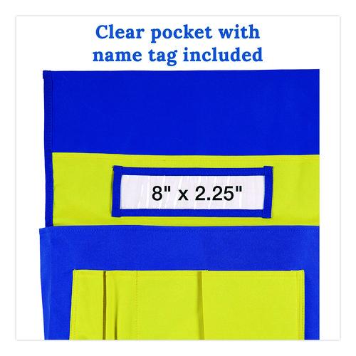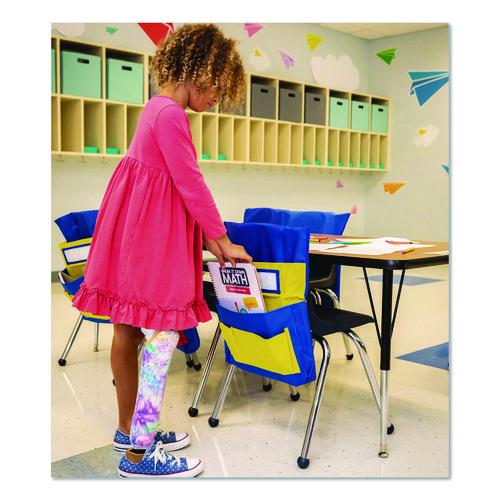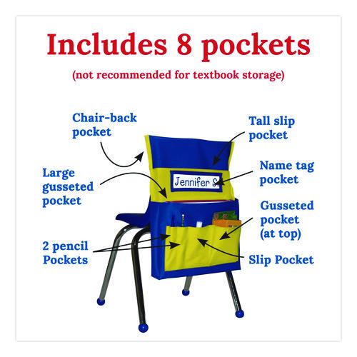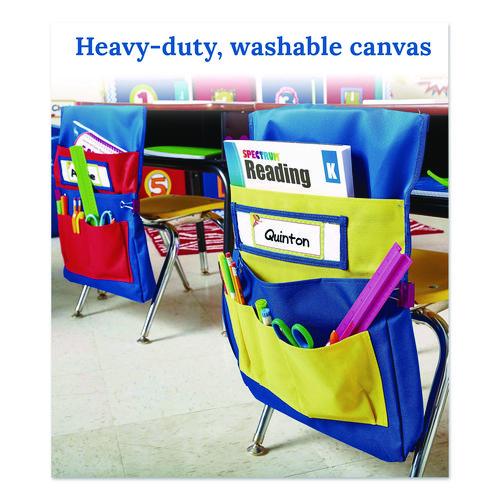 From workbooks to writing instruments, the Chairback Buddy™ makes it easy for students to store and organize their school supplies. Ideal for elementary schools, preschools, daycares and more, this classroom-chair pocket-organizer effortlessly slips right over a standard student chair's back, and its name tag pocket (name tag insert included) helps students customize and take ownership of their very own Buddy. Each organizer features a range of pockets in several sizes to accommodate pens, pencils, crayon sets, calculators, folders, composition books, rulers and more. Colorful, attractive and ultra-durable, each pocket organizer is constructed of heavy-duty, flame-retardant, washable PVC-coated canvas to ensure excellent results even after heavy, long-term use.Package Includes: (1) Customizable Name Tag Insert