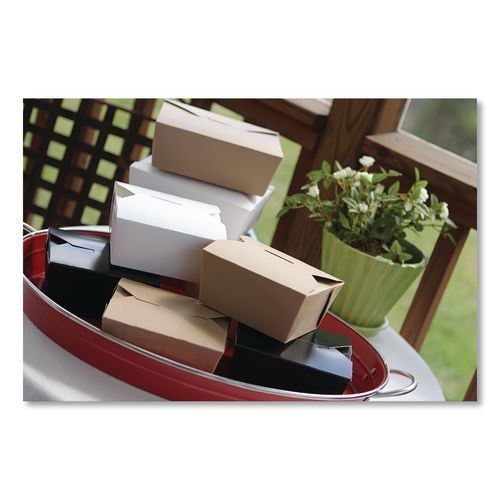 Make a great impression with your patrons when you provide these handsome boxes for carryout. Integrated lid features a tuck-top-locking closure. Polycoated interior minimizes the potential for leakage. Nestable design simplifies prep and storage.