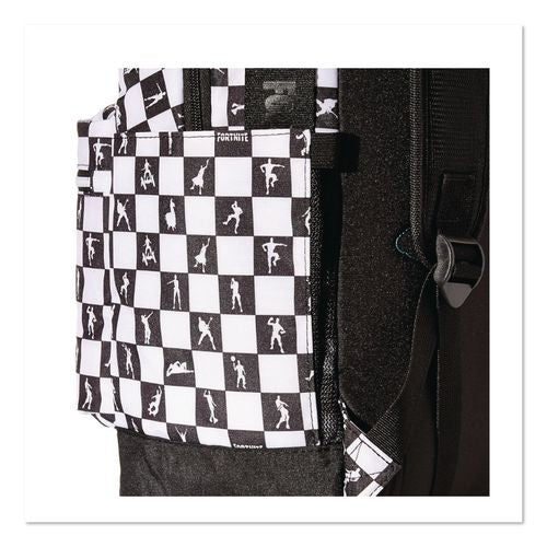 Take your Fortnite fandom with you to school and anywhere you might go. Featuring a checkered pattern and various characters from the game, this backpack has a design that's as tasteful as it is iconic, making it suitable for fans of all ages. Whether you're carrying books or personal belongings, its spacious main compartment with internal laptop sleeve and front accessories pocket with internal supplies organizer provide the room you need. And to help ensure carrying comfort, it also features padded adjustable shoulder straps and a quilted back. For added convenience, an expanding side pocket accommodates most water bottles, so you can easily stay hydrated as you explore the world beyond the walls.