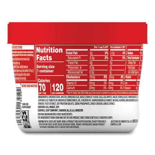Comfort your soul wherever you go with Campbells Chicken Noodle Soup Microwavable Bowl. Our timeless recipe of seasoned chicken broth, egg noodles and tender chicken meat with no antibiotics is bundled into a convenient on-the-go container to enable you to savor our classic anytime, anywhere.Note: This is a non-returnable item.