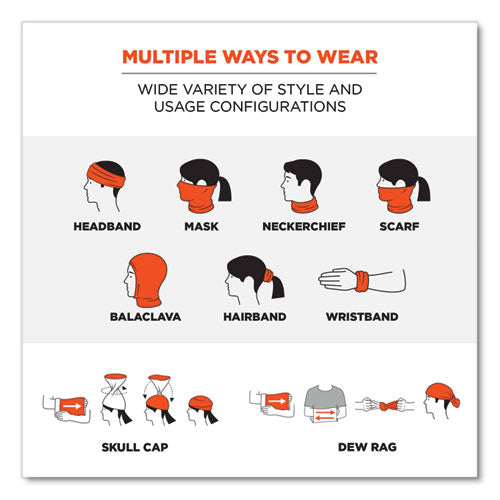 The Chill-Its 6487 Cooling Multi-Band offers head and face protection from the sun, dust and flying debris, as well as cooling relief. Plus, it features evaporative technology for immediate cooling, and UPF 50+ protection against the sun's harmful rays when working outside. Simply wet the cooling headwear to activate instant cooling relief that lasts for hours. When activated, this multi-band is lightweight and refreshing for even the hottest days of the year. Anti-Odor treatment keeps it fresh all day long. Hang dry or machine wash as needed. This PPE safety headwear is incredibly versatile. The soft, stretchable knit material allows the multi-band to be worn as a cooling headband, neck gaiter, face mask or face covering, hat, dew rag and more. It can also be worn under a hard hat for moisture-wicking cooling when dry, and instant evaporative cooling relief when wet.Note: This is a non-returnable item.