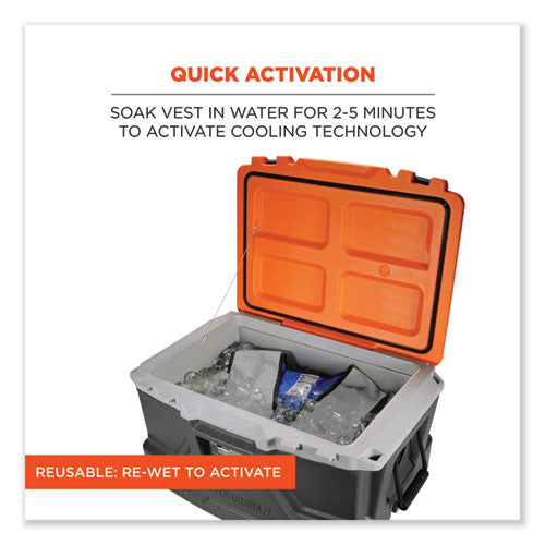 The Chill-Its 6665 Evaporative Cooling Vest is made with an advanced polymer-embedded fabric to provide workers with immediate core cooling relief from the heat. This lightweight cooling vest is made of comfortable and durable quilted nylon exterior with mesh side panels for ventilation and stretch. Wear this body cooling vest over a t-shirt. A water-repellant liner keeps the interior of the vest as dry as possible when activated, though wearers should expect to feel some dampness/wetness. Evaporative cooling technologies such as embedded polymers are a simple, effective and comfortable solution for heat stress prevention. Similar to how sweat cools the body, evaporative technologies use an external water source to draw heat away helping to regulate body temperature while providing cool relief. In order to activate, soak in water for two to five minutes. The embedded polymers will retain water for up to four hours of cooling relief. Hand wash as needed and hang to dry.Note: This is a non-returnable item.