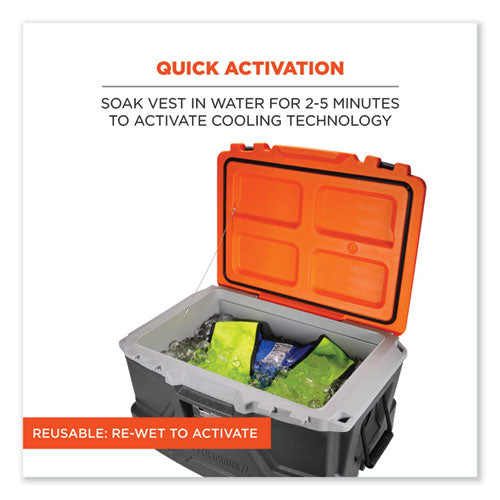 The Chill-Its 6665 Evaporative Cooling Vest is made with an advanced polymer-embedded fabric to provide workers with immediate core cooling relief from the heat. This lightweight cooling vest is made of comfortable and durable quilted nylon exterior with mesh side panels for ventilation and stretch. Wear this body cooling vest over a t-shirt. A water-repellant liner keeps the interior of the vest as dry as possible when activated, though wearers should expect to feel some dampness/wetness. Evaporative cooling technologies such as embedded polymers are a simple, effective and comfortable solution for heat stress prevention. Similar to how sweat cools the body, evaporative technologies use an external water source to draw heat away helping to regulate body temperature while providing cool relief. In order to activate, soak in water for two to five minutes. The embedded polymers will retain water for up to four hours of cooling relief. Hand wash as needed and hang to dry.Note: This is a non-returnable item.