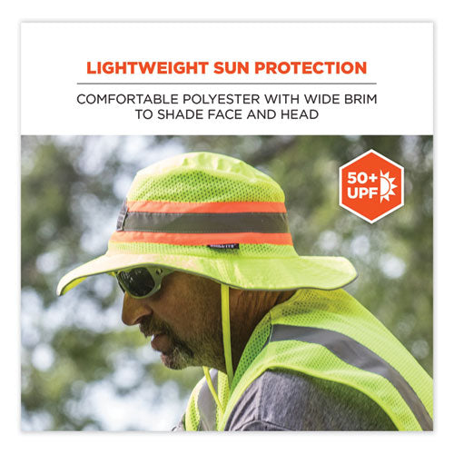 The Chill-Its 8935MF Hi-Vis Sun Hat is a lightweight and breathable sun protection hat with advanced microfiber cooling technology lining the rim for relief in extreme heat. This 150D polyester sun hat is rated to UPF 50+ and features a wide brim for complete face and head coverage, while 360-degree mesh venting maximizes airflow for breathable comfort. The hi-vis colors and 1" reflective tape are ANSI 107-approved to keep workers safe and seen. Evaporative cooling technologies such as microfiber are a simple, effective and comfortable solution for heat stress prevention. Evaporative technologies use an external water source to draw heat away helping to regulate body temperature while providing cool relief. Run the inside rim of the sun hat under water for one minute to activate instant cooling relief that lasts up to three hours. The ultra-absorbent microfiber will retain water while remaining soft and comfortable.Note: This is a non-returnable item.