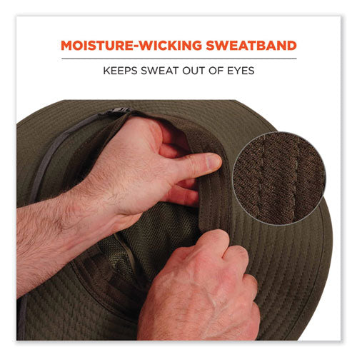 The Chill-Its 8936 Ranger Hat provides lightweight, breathable head and face shade for working in the sun. This sun hat is rated to UPF 50+ for protection from harmful UV rays and features a wide brim that can be worn down or snapped up and out of the way. Mesh side vents maximize airflow, and a moisture-wicking sweatband keeps sweat out of eyes to keep workers cool and comfortable. Includes breakaway drawstring chin cord and adjustable cinch cord in back for a custom, secure fit. This sun protection hat fits a variety of face and head sizes. Ideal for those working in hot environments where shade is needed, including agriculture and landscaping. Can also be used for outdoor recreation such as hiking, fishing or gardening.Note: This is a non-returnable item.