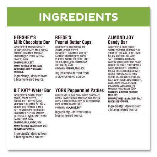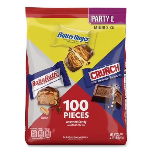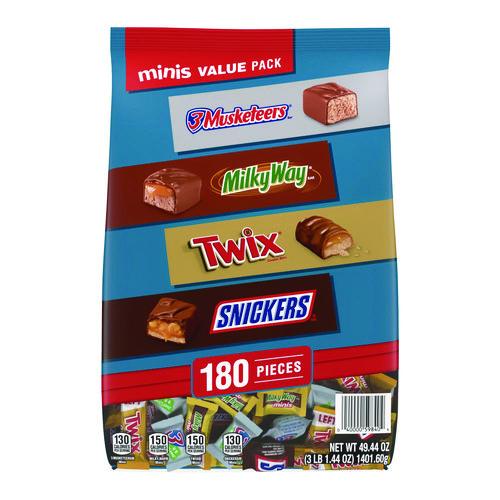 Enjoy a delicious milk chocolate treat anywhere and anytime with this value pack of Hershey, Mars and Nestle assorted candy! Offering twelve different miniature crowd-pleasing favorites, this candy assortment is perfect for sharing with family, friends, teammates or co-workers. Take this chocolate favorites bundle into the office break room, pour some individually wrapped candies into your jar at home or take a bag to your next sports game to celebrate the win. This assortment includes Kit Kat, Reese's peanut butter cups, Hershey's milk chocolate candy bars, York peppermint patties, Almond Joy, Butterfinger, Nestle Crunch, Baby Ruth, 3 Musketeers, Milky Way, Twix and Snickers. Perfect for parties, sidelines, holidays and fundraisers!Package Includes: (1) 180-Piece Bag Minis Value Pack; (1) 100-Piece Minis Party Pack; (1) Chocolate Assortment Party PackNote: This is a non-returnable item.