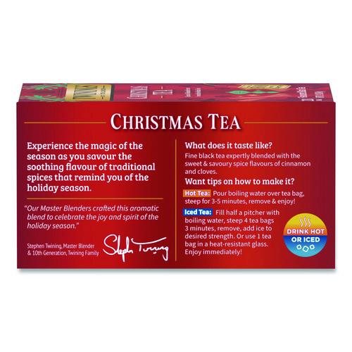 Create a merry moment with Twinings Christmas Tea. Made without artificial ingredients, Twinings natural teas provide a wholesome tea experience. Our Christmas Tea is an aromatic blend that combines the finest black teas with the sweet and savory flavors of cinnamon and clove. This fine black tea is sure to bring you holiday cheer with its warm, spicy taste and soothing aroma.Note: This is a non-returnable item.