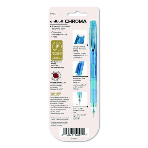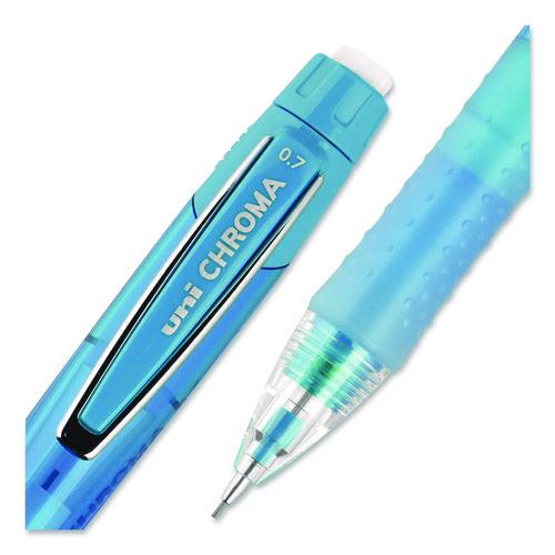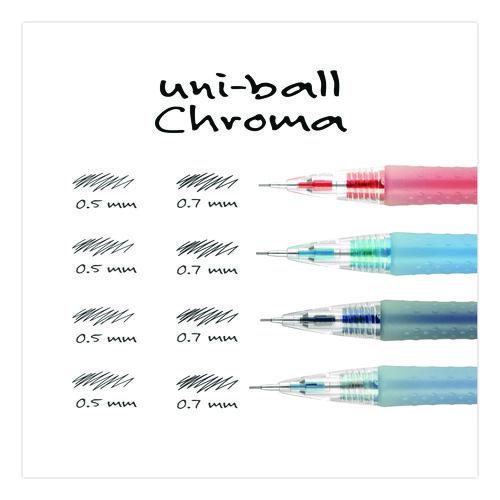 Draw, write, sketch or illustrate with CHROMA Mechanical Pencils from uni-ball. These 0.7 mm HB #2 mechanical pencils feature auto-advancing lead, so you won't experience any interruptions as you write. A shock-absorbing cushioned point reduces lead breakage and facilitates smooth writing. Create vivid text and graphics with 0.7 mm mechanical pencils, which produce striking, dark marks. This side click mechanical pencil comes with a unique hexagonal eraser that has twelve points and edges for optimal editing prevision. Ideal for school work, art projects and note-taking, these refillable pencils have a comfort grip that reduces fatigue while helping you maintain control. CHROMA combines the most popular features requested by mechanical pencil lovers so you can enjoy cutting-edge performance with an endless flow of ideas.Package Includes: (1) Tube of (10) 0.7 mm HB (#2) Leads; (2) Refill Erasers