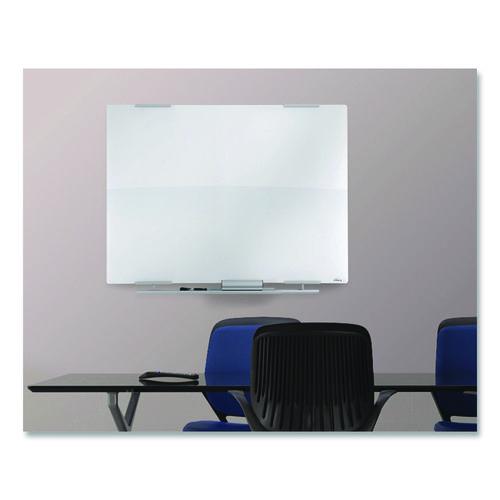Frameless, seamless, hi-tech design with architectural quality. Combining form and function, this premium glass dry erase board features design and performance. Markers glide across the glass surface while the ultra-white backing makes writing bold and highly visible. Aluminum mounting elements allow the frameless design to "float" off the wall. 1/4" tempered safety glass will never stain or ghost. Includes clip-on marker and adjustable eraser tray.Package Includes: Marker/Eraser Rail; Mounting Kit
