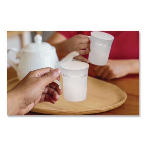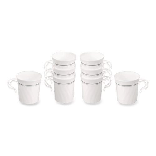 These lovely mugs have a classic, upscale design that adds elegance to any occasion. Unique design of the handle allows the customer to hold the mug while keeping fingers away from the hot center of the cup. They offer the look of china without the delicate breakability. Provide the beauty and charm of fine china with the ease of a disposable.