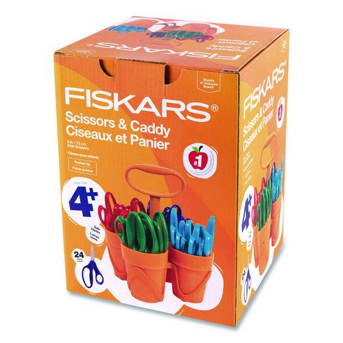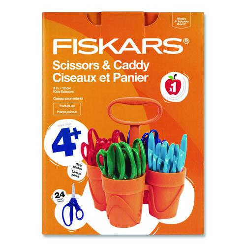 Includes a compact, sturdy carrier with four removable cups containing 24 pairs of scissors in four vibrant colors, plus a convenient carrying caddy.