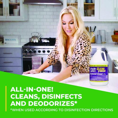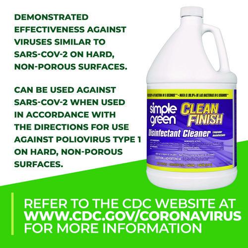 Cleans, disinfects and deodorizes when used according to disinfection directions. Use on hard non-porous surfaces. Kills 99.9% of bacteria in five seconds (Staphylococcus aureus, Klebsiella pneumoniae). Use in homes, schools, veterinary clinics, gyms, motels, kennels, daycare centers and more. Kills cold (Rhinovirus) and flu. Simple Green® Clean Finish has demonstrated effectiveness against viruses similar to SARS-CoV-2 on hard, non-porous surfaces when used as directed. Therefore, Simple Green Clean Finish can be used against SARS-CoV-2 when used in accordance with the directions for use against Poliovirus Type 1 on hard, non-porous surfaces. Refer to the CDC for additional information.